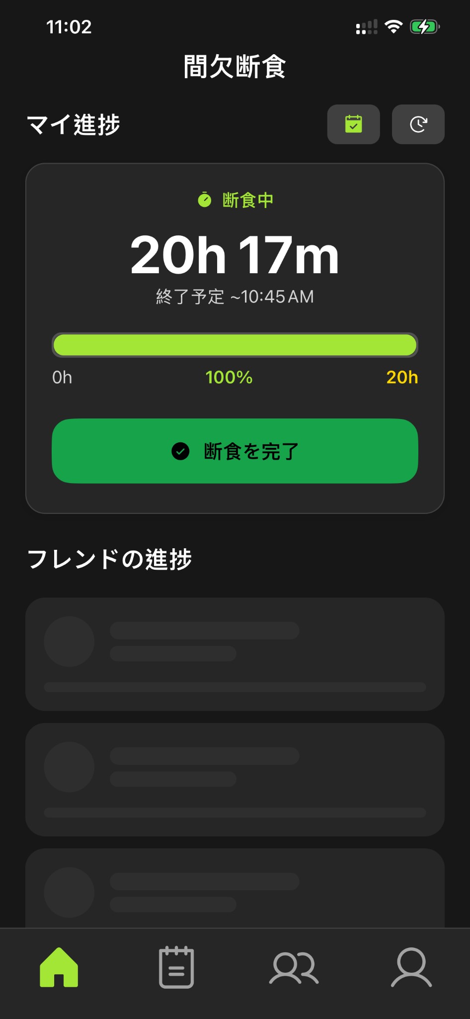 16:8、18:6、OMADから選択、またはカスタム設定も可能。視覚的なカウントダウンで断食を管理。