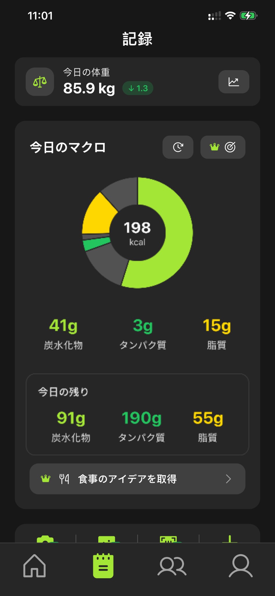 たんぱく質、脂質、炭水化物を直感的なダッシュボードで記録。毎日の進捗を一目で確認できます。